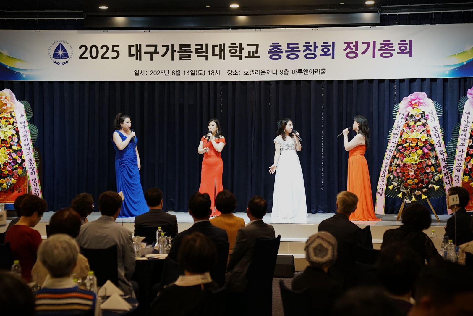 소프라노 강다현(성악과/92), 소프라노 김보경(성악과/94), 소프라노 용문휘(성악과/98), 소프라노 전선영(성악과/01)의 축하공연을 시작으로, 대구가톨릭대학교 총동창회 2025 정기총회가 개최되었습니다.